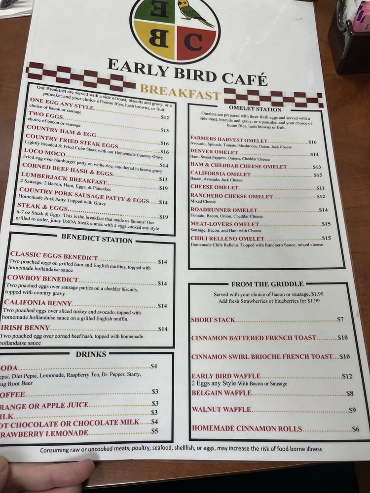 Welcome to Early Bird Cafe, a charming spot in Hemet, CA, dedicated to the art of American breakfast and brunch. This cafe shines with its extensive menu, featuring delights like the homemade corned beef hash and the classic chicken fried steak. One standout is the Farmers Harvest Omelet, packed with fresh, locally-sourced ingredients like avocado, spinach, and mushrooms. The cozy atmosphere, perfect for families or casual brunch with friends, is complemented by friendly service, ensuring every visit is memorable.